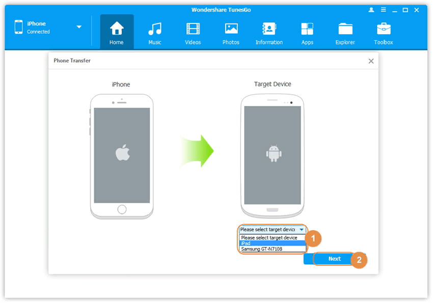 - Выбрав источник, нужно указать устройство, на которое будет переноситься файлы;