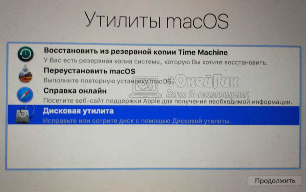 Чтобы перейти в режим восстановления, при загрузке компьютера удерживайте клавиши Command+R. Загрузка в режиме восстановления ознаменуется экраном с заголовком “Утилиты MacOS (OS X Utilities). Выберите в списке доступных утилит “Дисковая утилита” и нажмите “Продолжить”;