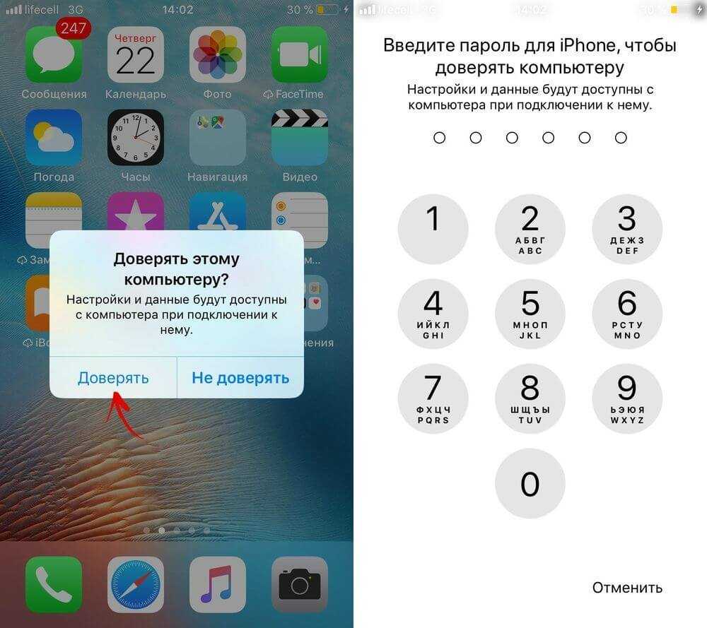 Подключите iPhone через USB. При появлении запроса «Доверять этому компьютеру?», выберите «Доверять» и введите пароль от смартфона.