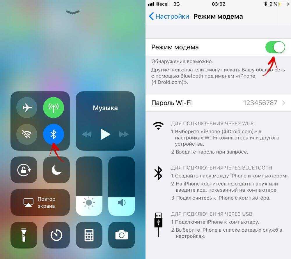 Если на момент включения у вас будут отключены Wi-Fi и Bluetooth, iPhone предложит включить их, чтобы была возможность использовать его не только в качестве модема через USB, но и по Bluetooth. Также ниже вы можете указать свой пароль для Wi-Fi сети, раздаваемой iPhone, в случае если будете использовать его как точку доступа.