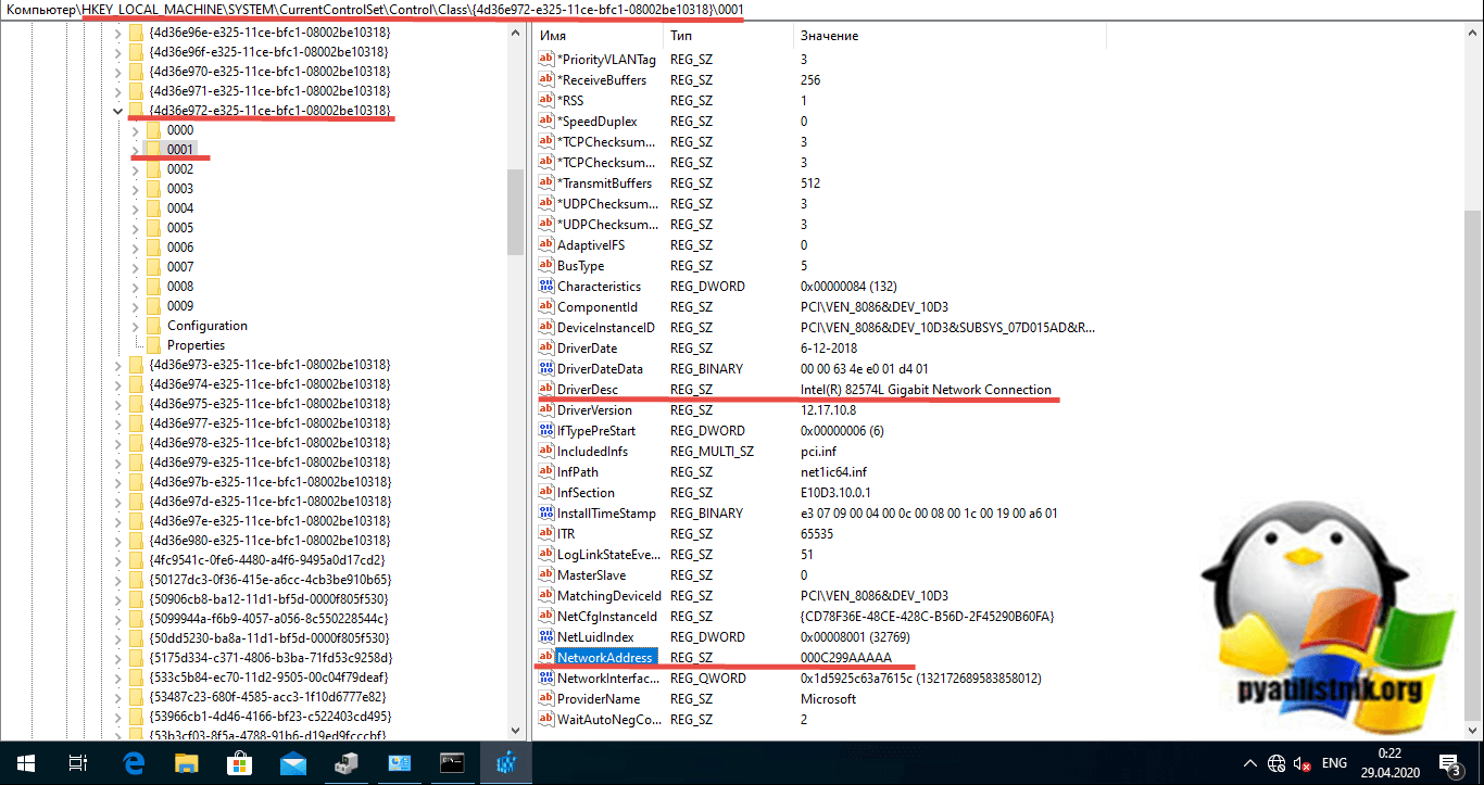 Тем более, что встречаются драйверы сетевых карт не поддерживающие изменение mac адреса и в дополнительных свойствах не отображают «Network Address», или «Физический адрес». Тогда поможет «хирургический» способ – изменение редактированием реестра Windows.