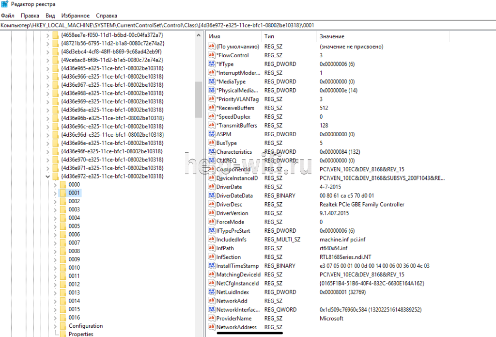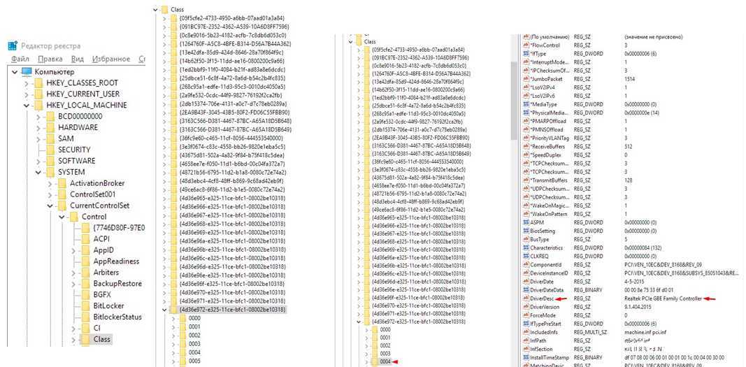 Надо последовательно проверить папки 0000, 0001… 0003. Параметр «DriverDesc» укажет реальное название сетевой карты.