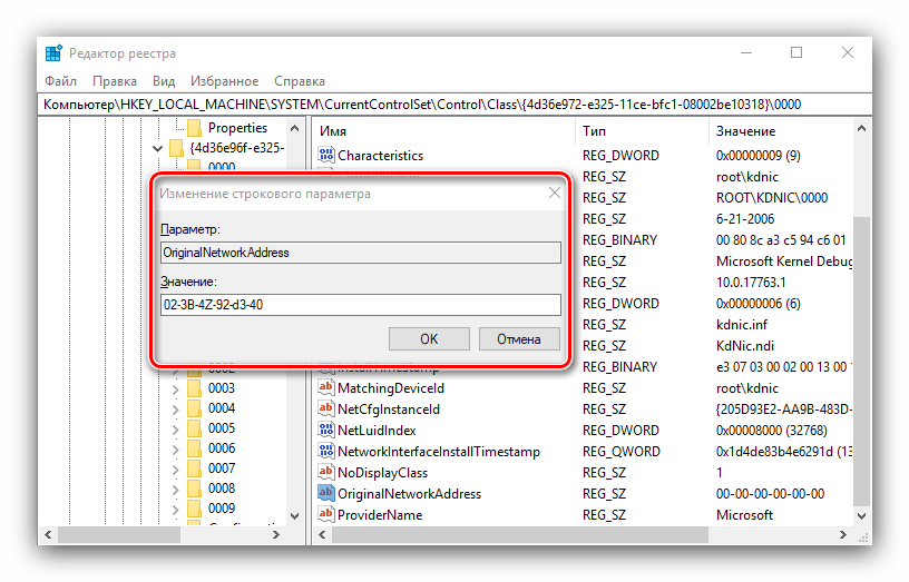 Вместо текущего значения впишите желаемый MAC-адрес, соблюдая шаблон. После ввода нажмите «ОК».