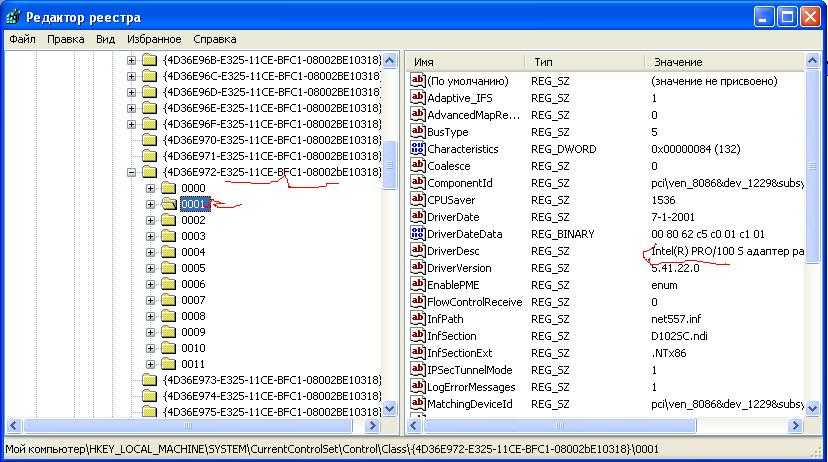 В папке Class найти значение 4D36E972-E325-11CE-BFC1-08002BE10318 и открыть. Просматреть папки 0000, 0001, 0002 и т.д. пока справа не появится DriverDesc и сетевая карта. В этом примере Intel(R) PRO/100.