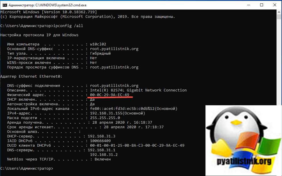 Каждый сетевой адаптер (Network Interface Card) имеет уникальный MAC-адрес (Media Access Control). Это относится ко всем типам сетевых карт, включая карты Ethernet и WiFi. MAC-адрес (Физический адрес) представляет собой шестибайтовое число или 12-значное шестнадцатеричное число, которое используется для уникальной идентификации хоста в сети. Для примера я вам покажу свой тестовый сервер с Windows 10. Самый быстрый метод его узнать, это выполнить в командной строке команду ipconfig /all. У меня физический адрес (MAC-адрес) имеет значение «00-0C-29-9A-EC-49».