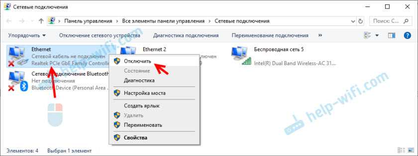 Правой кнопкой мышки щелкаем по сетевому адаптеру, выбираем в меню «Отключить»