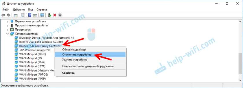 Отключить Realtek PCIe GBE Family Controller можно в том же диспетчере устройств. Просто нажимаем на него правой кнопкой мыши и выбираем «Отключить устройство».
