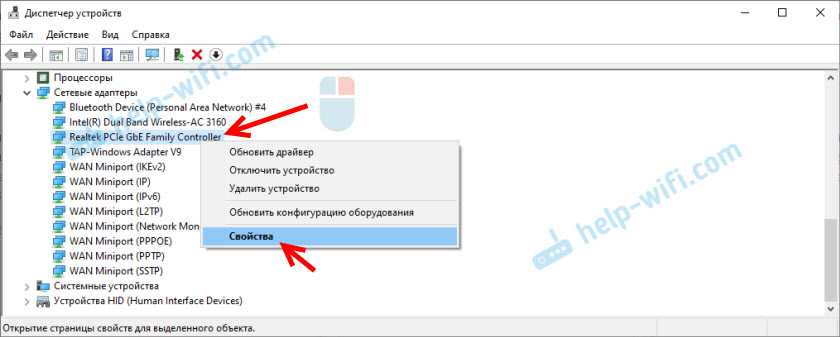 В диспетчере устройств нажимаем правой кнопкой мыши на сетевую карту и открываем «Свойства».