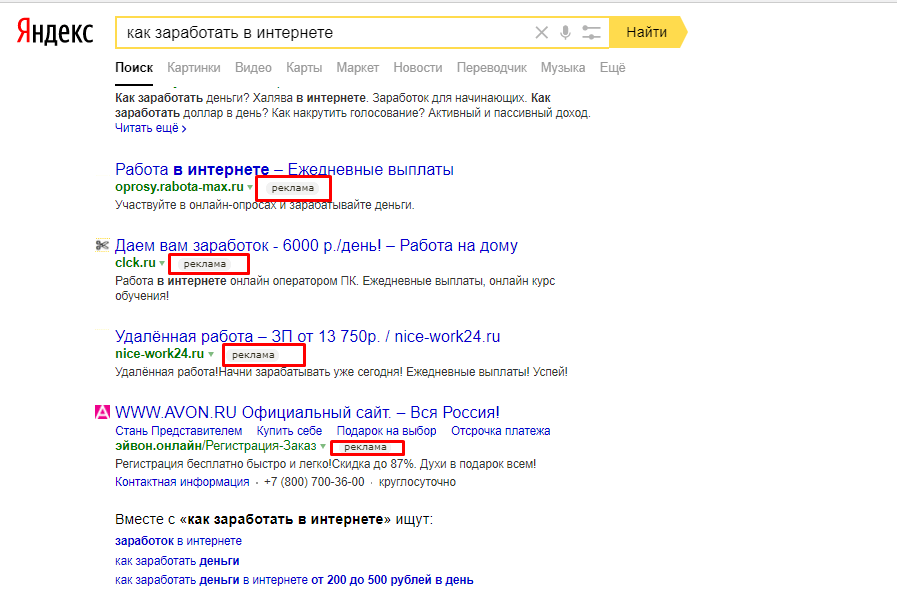 А вот «Как заработать в Интернете» с точки зрения рекламодателя это уже целевой запрос. Так как его набирает человек который ищет ответ на свой вопрос, способ, метод или сайт где можно заработать. И рекламодатели соответственно показывают своё предложение в этой нише.
