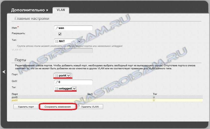 Здесь в поле Порт выбираем выделенный под STB-приставку 4-й порт, в поле Тег ставим значение untagged. Нажимаем кнопку Сохранить изменения. В результате в таблице VLAN должно получиться так: