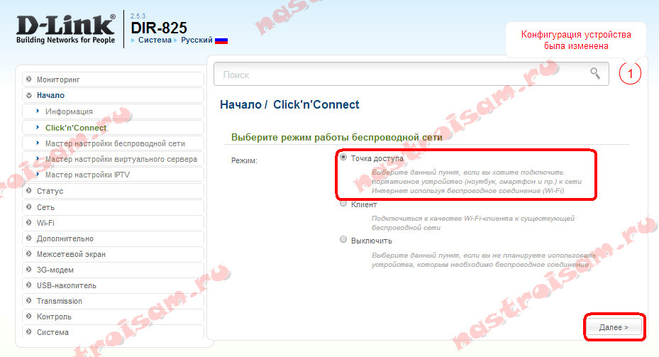 Выбираем «Режим» — «Точка доступа» и нажимаем «Далее».