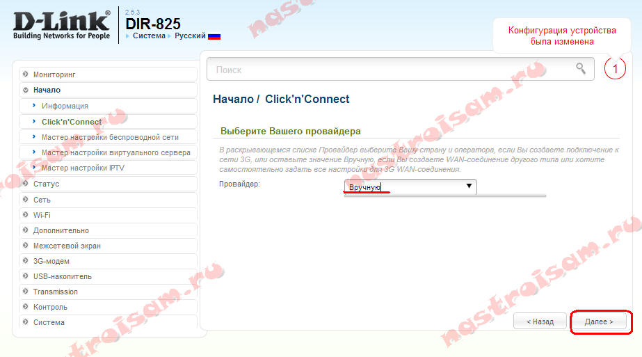 В качестве первого шага Вас попросят подключить WAN-кабель в разъем Интернет. Это сделать желательно, но не обязательно. Нажимаем на «Далее». Вас попросят выбрать провайдера: