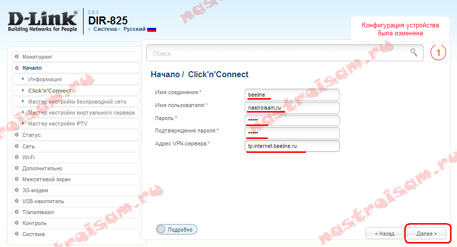 Так же, надо ввести «Адрес VPN-сервера» — tp.internet.beeline.ru. Нажимаем кнопку «Далее».
