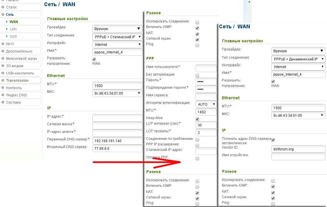 «PPPoE + Статический IP» или «PPPoE + Динамический IP»