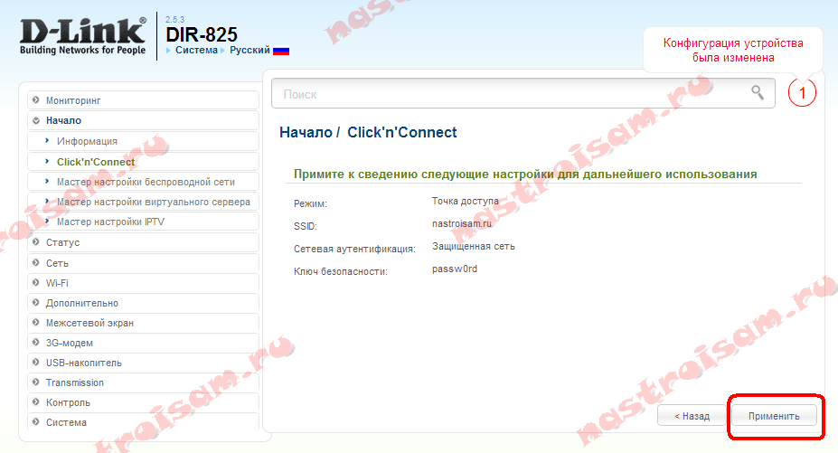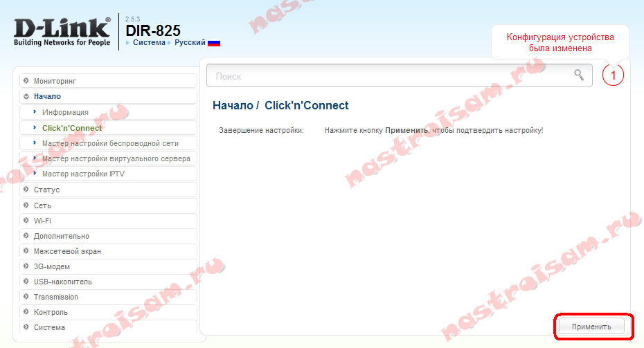 По завершению настройки интернет-соединения на роутере DIR 825A нажмите «Применить».