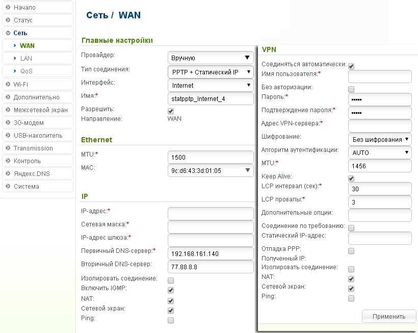 Для создания интернет-соединения перейдите в меню «Сеть» и откройте раздел «WAN».