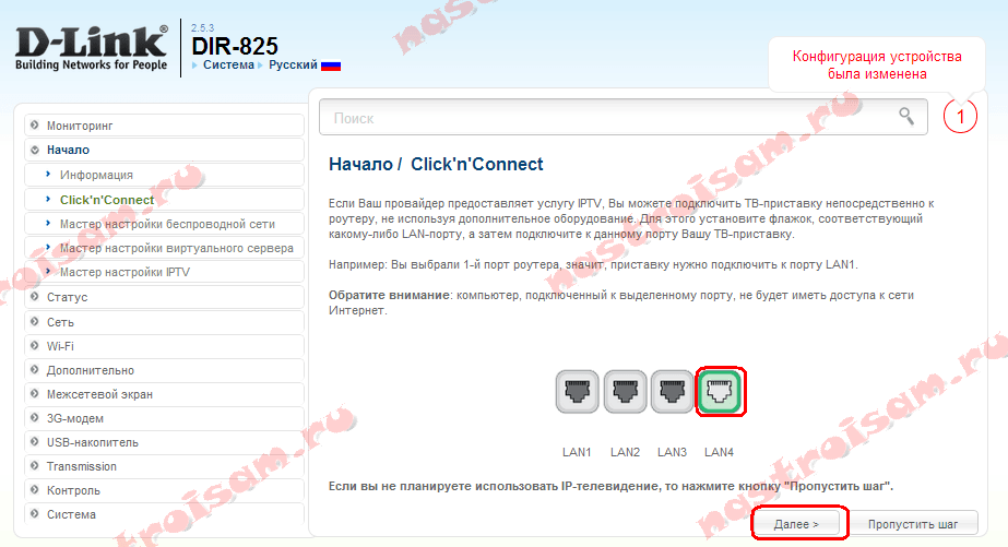 Если У Вас не подключена услуга IPTV — нажимаем кнопу «Пропустить Шаг». Иначе, выбираем порт, в который подключена ТВ-приставка и жмём «Далее». Примечание: Тут я заранее предупрежу, что такой вариант настройки цифрового телевидения не подойдет, если у Вас ТВ-трафик (мультикаст) приходит в тегированном виде и нужно указывать VLAN ID. В этом случае IPTV надо настраивать в разделе «Дополнительно».
