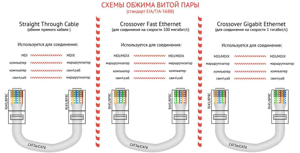 Распиновка RJ-45 бывает двух типов: прямая и перекрёстная (кросс-кабель). Первый способ используется, если требуется подключить оконечное устройство к роутеру. Проще говоря, прямая схема используется для подключения разнотипных устройств, перекрёстная – если требуется соединить между собой 2 компьютера, или пару маршрутизаторов.