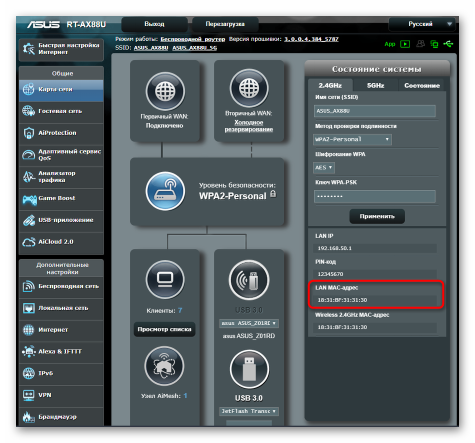 Роутеры от компании ASUS обладают самыми продвинутыми и слегка запутанными интерфейсами, в связи с чем расскажем о таких моделях тоже. Главное меню у них называется «Карта сети», а LAN MAC-адрес отображается справа внизу, где показаны основные сведения о локальной сети.