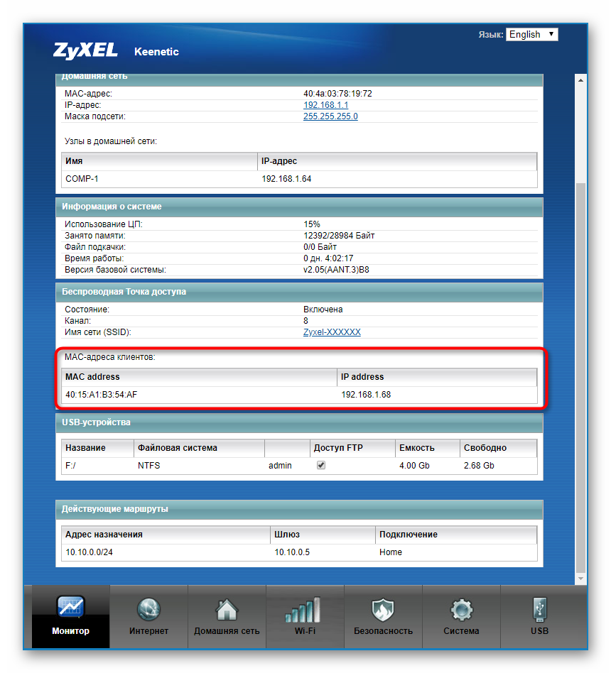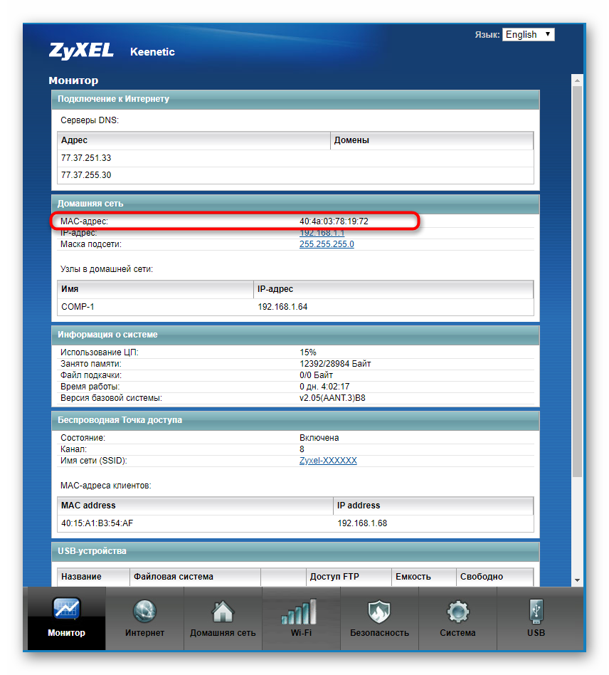 Следующим рассмотрим веб-интерфейс от ZyXEL Keenetic, чей внешний вид немного отличается от общепринятого. После авторизации в интернет-центре вы попадаете в раздел «Монитор». Здесь посмотрите на блок «Домашняя сеть», где и определите MAC-адрес устройства. При необходимости его можно без проблем скопировать, выделив и зажав комбинацию клавиш Ctrl + C.