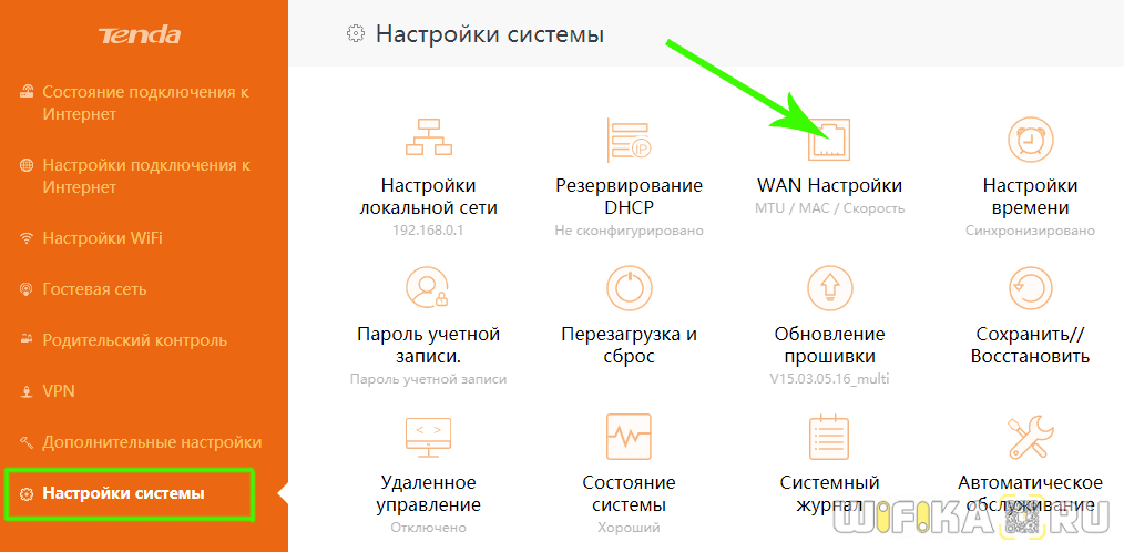 Для смены MAC в маршрутизаторах Tenda заходим в меню «Настройки системы» и выбираем здесь «WAN настройки».