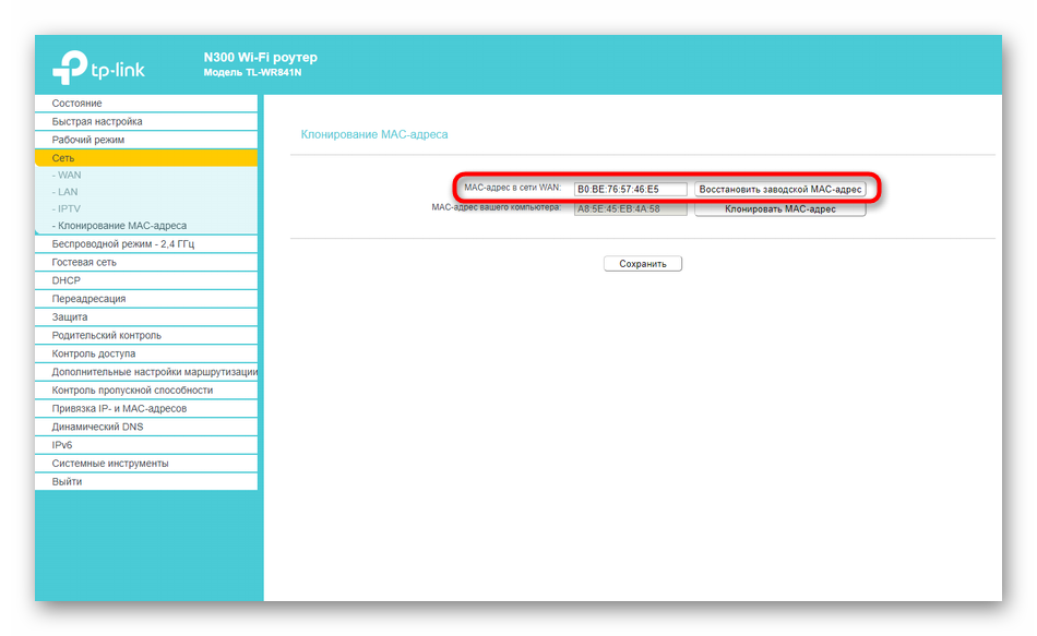 Посмотрите на поле «MAC-адрес в сети WAN». Сейчас вы можете его восстановить, если это нужно.