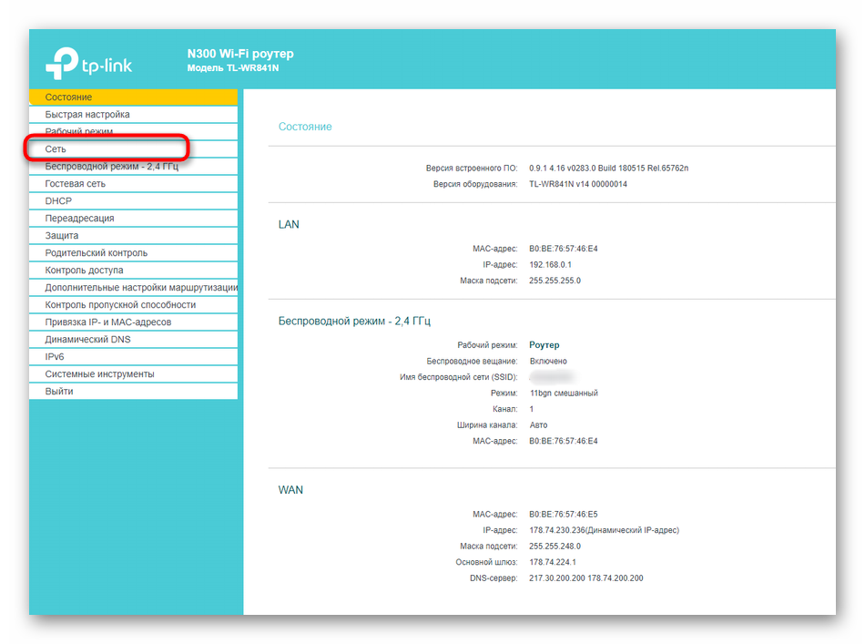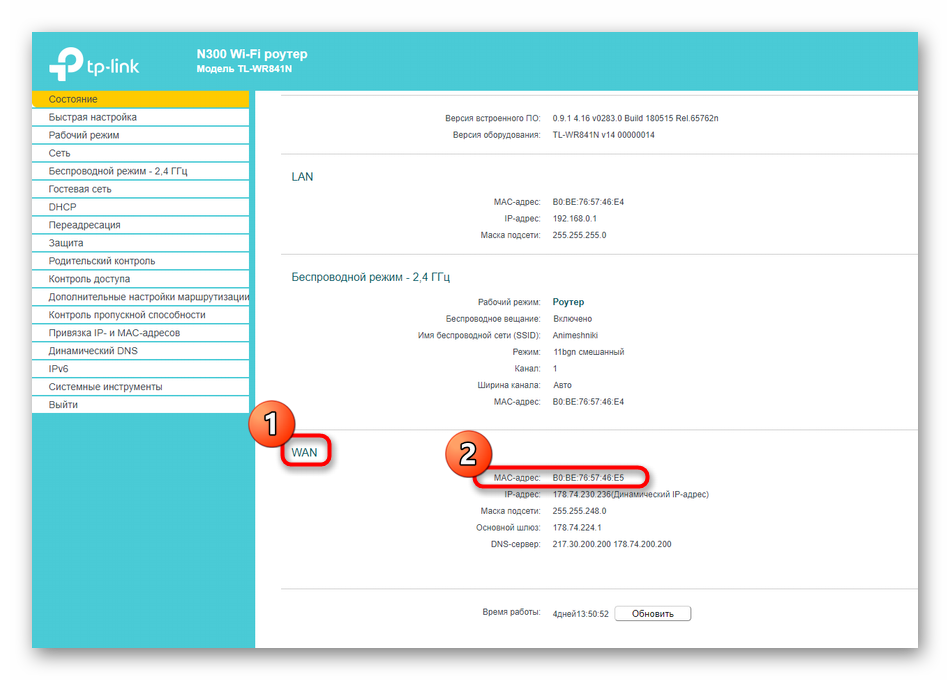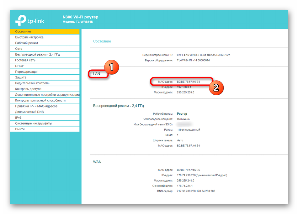 Компания TP-Link — один из самых популярных производителей сетевого оборудования с привычным для многих интерфейсом интернет-центра, поэтому мы остановились на его устройствах в первую очередь. Для определения локального MAC-адреса нужно только выполнить авторизацию, чтобы оказаться в разделе «Состояние»