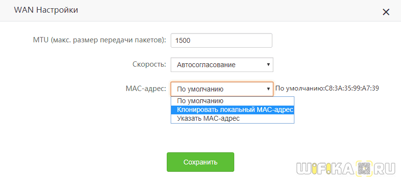 Кнопка «Клонировать» позволяет изменить MAC-адрес роутера на адрес сетевой карты компьютера, к которому он подключен