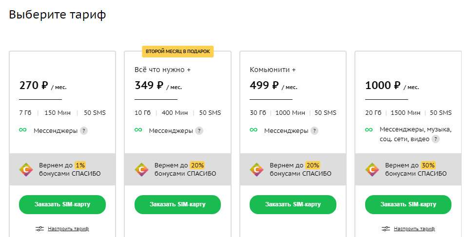 - Тариф «Комьюнити+». Пакет стоит 499 руб/месяц и включает снова-таки 50 сообщений на все мобильные по России, а также 1000 минут. Есть 30 Гб на расходование в интернете. Тоже бесплатными будут для вас 4 мессенджера, которые мы указали выше. До 20 % от расходов клиент возвращает через Спасибо.
