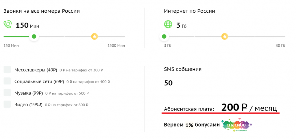 Сим карта работает вместе с пакетом услуг от Сбербанка. Его вы можете выбрать из 4 имеющихся с готовым набором услуг, лимитами. Но также предлагается и пятый вариант — подбор тарифа на своё усмотрение. То есть клиент сам указывает нужное количество минут, сообщений, Гб и т.д.
