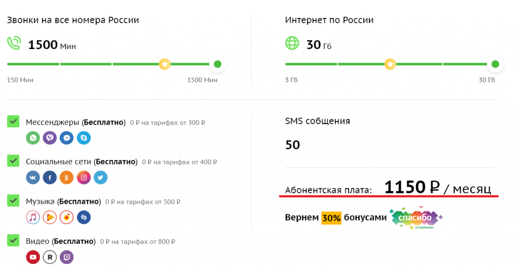- Пакет за 1000 рублей в месяц — самый дорогой, но и обладает наибольшими возможностями: уже 1500 минут на разговоры, те же 50 сообщений и целых 20 Гб. Бесплатными являются не только популярные мессенджеры, но и платформы с музыкой, видео контентом, социальные сети. Здесь у вас получится вернуть до 30 % путём получения на счёт баллов Спасибо.
