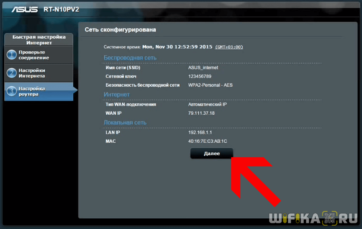 - Для завершения автоматической настройки роутера сверьте введенные ранее данные. Если все правильно, то жмите «Далее».