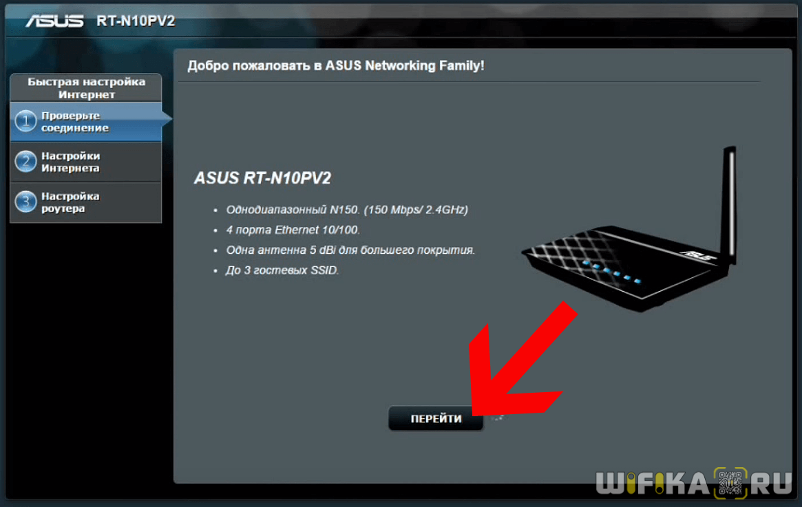 После входа в панель управления мы попадаем в мастер быстрой настройки, что очень удобно для пошаговой установки подключения Асус к интернету, особенно для новичков. В первом окне просто жмем на «Перейти»
