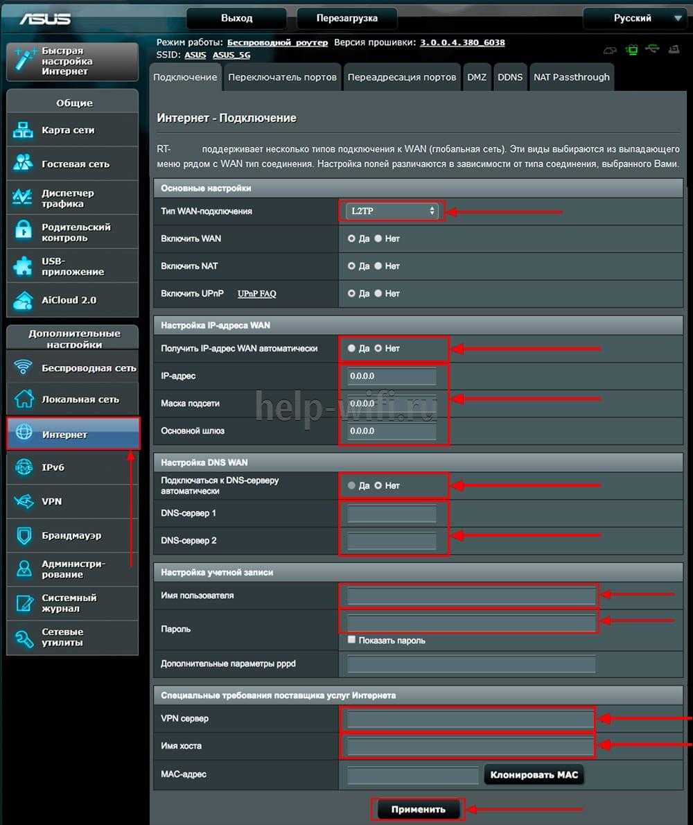 - Для строки «Тип WAN-подключения» поставьте значение «L2TP». Три пункта, идущих ниже, отметьте маркером «Да».