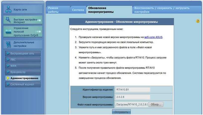 Данное действие не займет много времени, однако поможет избежать некоторых проблем при настройке устройства- asus n10 роутер. Для начала зайдем в браузер в адресную строку введем 192.168.1.1 или 192.168.0.1 в зависимости от прошивки устройства. По умолчанию логин и пароль – admin, и перейдет во вкладку «Администрирование/Обновление микропрограммы». Как видите на картинке, вначале предлагается проверка последней прошивки на официальном сайте компании Asus, если же у вас есть уже скачанная версия можно пропустить пункт 1 и 2, и выполнить поочередно остальные пункты, после чего нажать кнопку «Отправить».