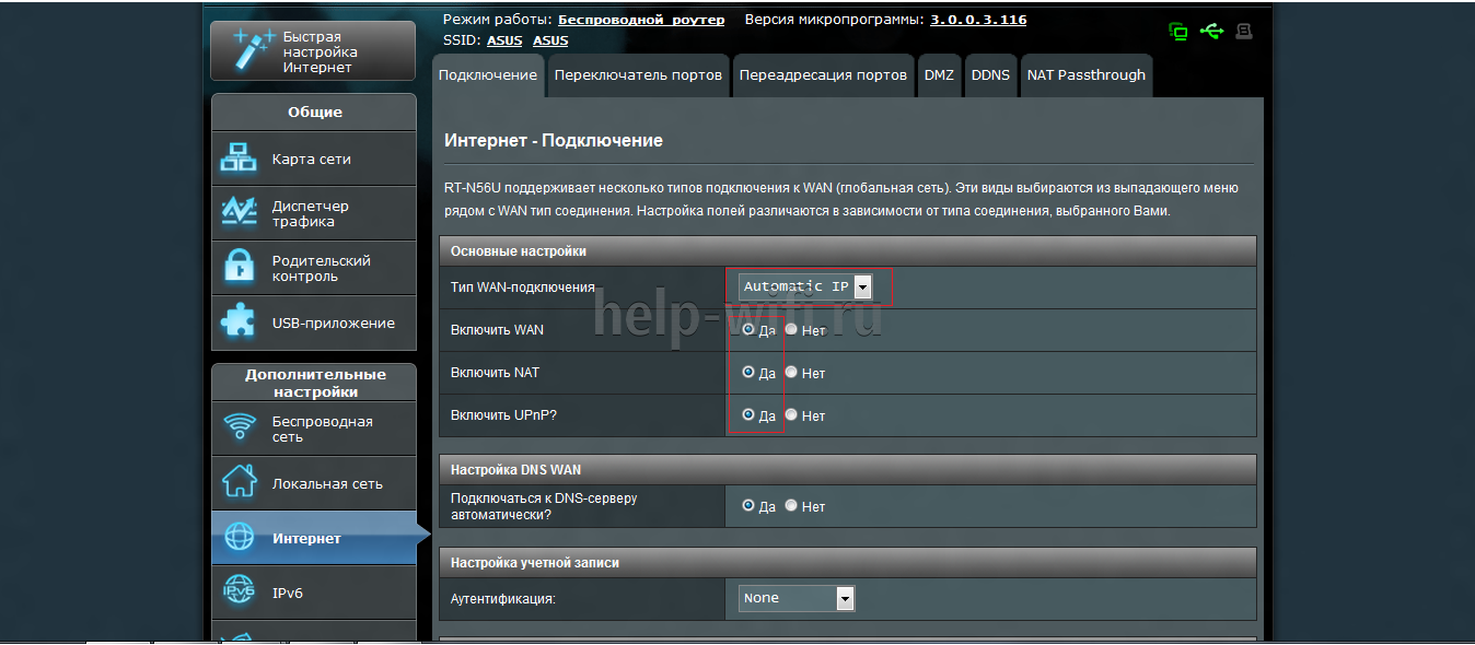 - В строке «Тип WAN-подключения» поставьте «Automatic IP». Остальные пункты в блоке «Основные настройки» отметьте маркером «Да».
