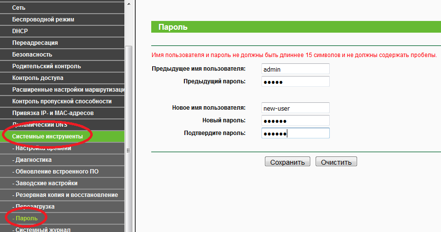 После этого сразу же идем на вкладку «Системные инструменты» – «Пароль» и меняем логин с паролем на свои и жмем «Сохранить». Обязательно запишите их на бумагу.