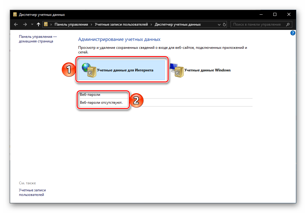 Как мы уже сказали в самом начале данной статьи, просмотр сохраненных паролей в Интернет Эксплорере возможен исключительно из-под учетной записи Администратора, которая, к тому же, должна быть защищена паролем. Если таковой не установлен, в «Диспетчере учетных данных» вы либо вообще не увидите раздела «Учетные данные для Интернета», либо не увидите только сохраненные в нем сведения. Решений в данном случае два – установка пароля на локальную учетную запись или вход в Windows с помощью учетной записи Microsoft, которая по умолчанию уже защищена паролем (или пин-кодом) и наделена достаточными полномочиями.