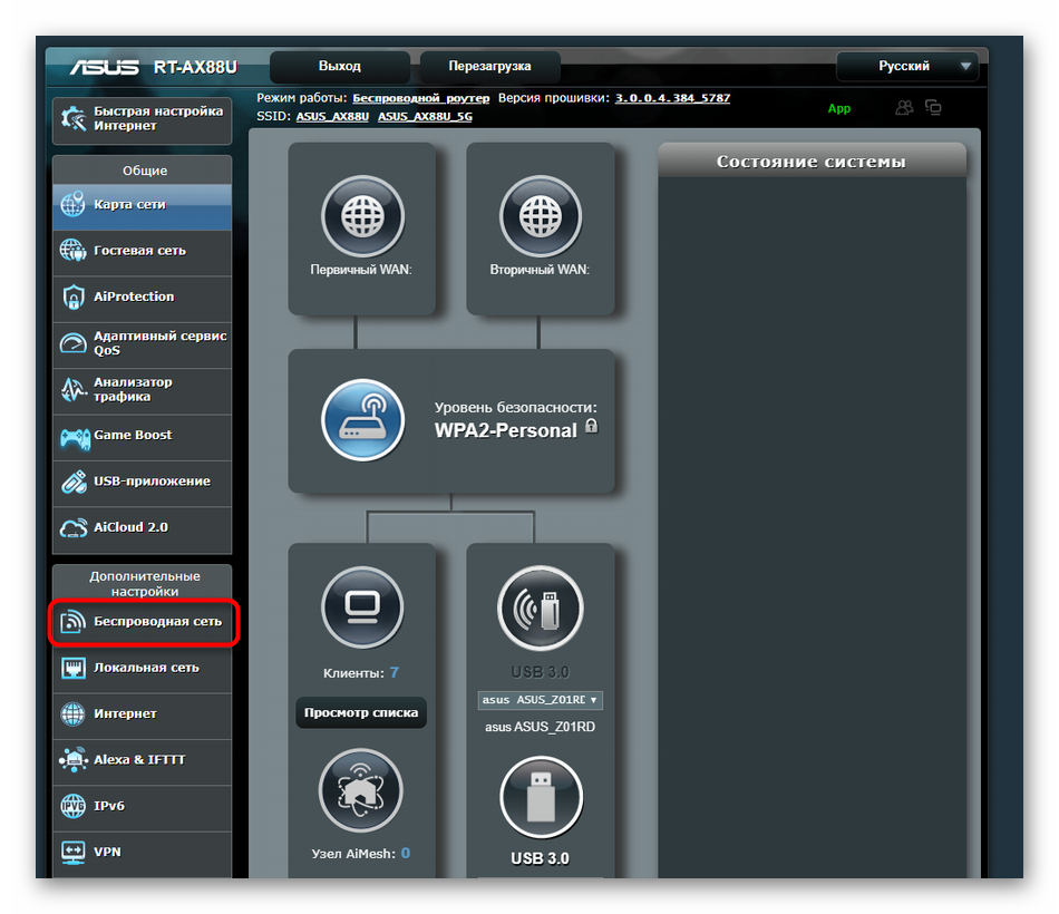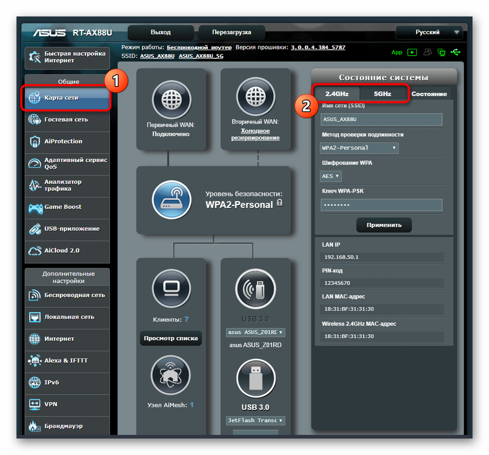 - Откройте веб-интерфейс и выберите раздел «Карта сети», если он не активен по умолчанию. Если роутер может работать в двух режимах, сначала потребуется выбрать частоту, переместившись на необходимую вкладку через раздел «Состояние системы».