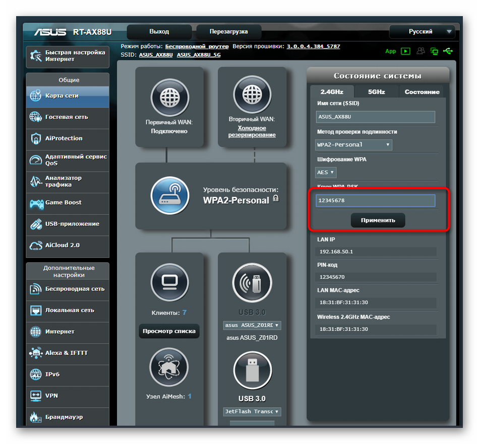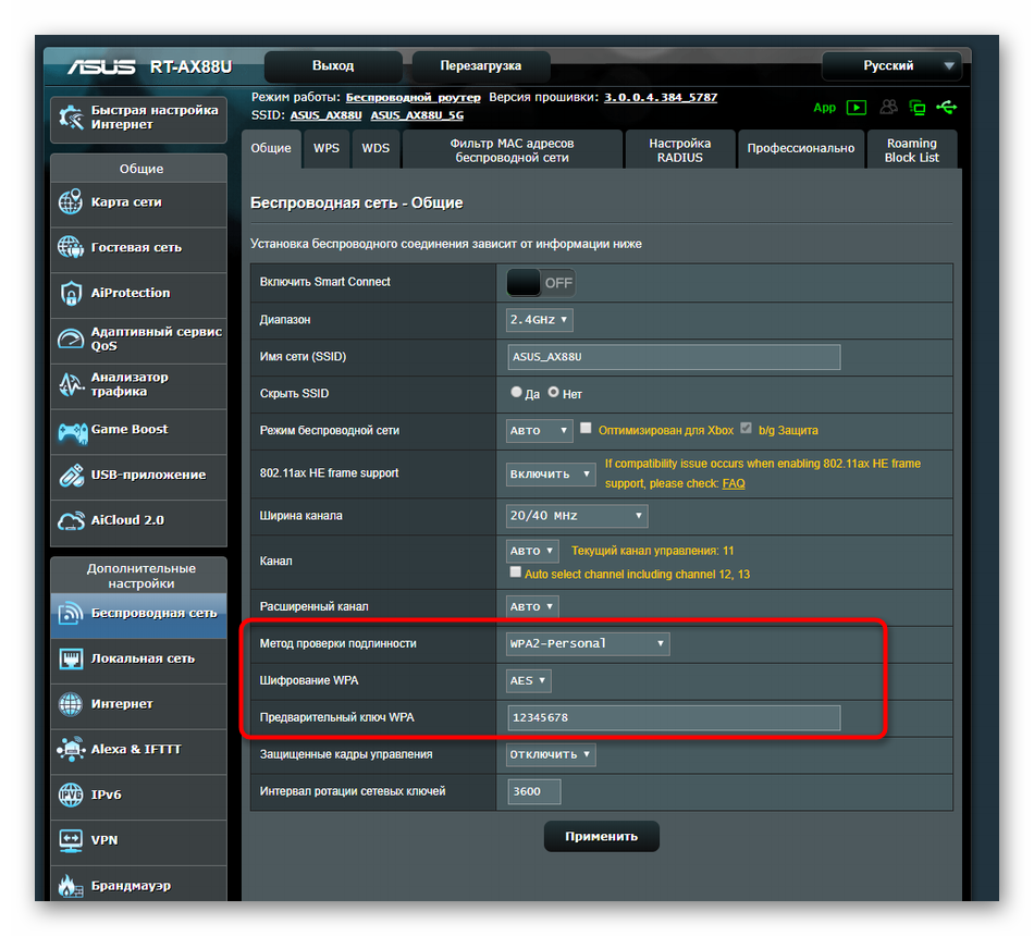 «Предварительный ключ WPA» придумаем и установим пароль. Этот тот самый пароль, который нужен, чтобы подключиться в wi-fi. Те, кто перенастраивает маршрутизатор Асус, здесь могут произвести смену пароля.