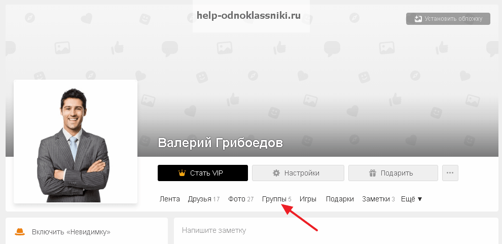 1) Для начала, если вы это не сделали раньше, надо зарегистрироваться на сайте. Как сделать страницу в Одноклассниках, читайте в нашей статье. Далее зайдите в свой профиль и откройте раздел «Группы» (где он расположен, написано и показано выше);