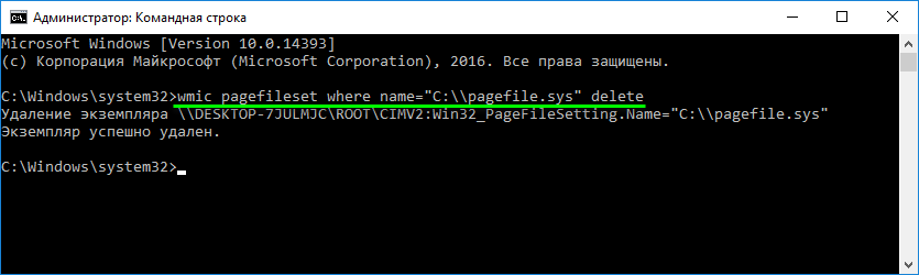Шаг 11. Не закрывая предыдущего окна, набрать команду, отключающую файл подкачки, если в системе основным диском является твердотельный диск SSD, нажав Enter. Файл подкачки на диске SSD иногда загружает HDD на 100%: wmic pagefileset where name=»C:\pagefile.sys» delete (где: name=»C:\pagefile.sys» – место нахождения файла)
