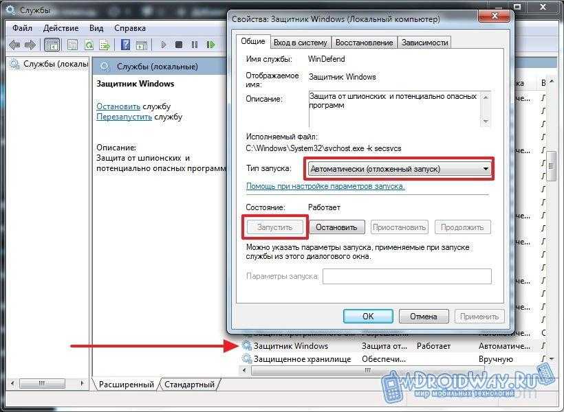 Откройте службу защитника. Перейдите на вкладку Тип запуска, выберите в выпадающем списке автоматически (отложенный запуск) и включите защитник, кликнув на «Запустить».