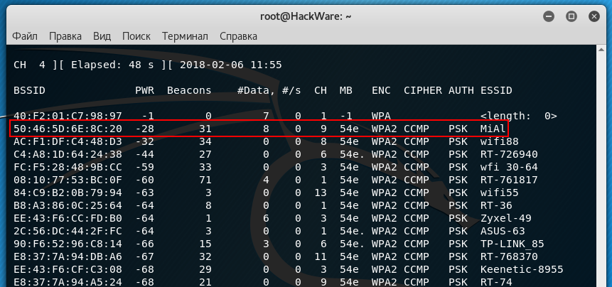 Допустим, в качестве цели я выбираю сеть MiAl, она находится на десятом канале (запоминаем это) и имеет BSSID 50:46:5D:6E:8C:20 (также запомним его):