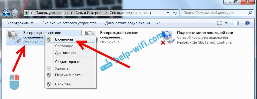 - Теперь можно увидеть, какие подключения установлены на ноутбуке. Одно из них является беспроводным. По нему кликают мышкой и в появившемся контекстном меню выбирают верхнюю строку «Включить».