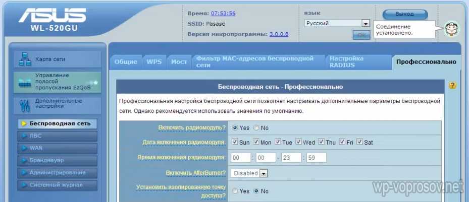 Устанавливается данный режим в разделе «Беспроводная сеть», вкладка «Профессионально». Выставляем дни недели для работы и часы.