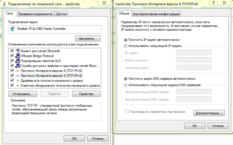 2.Еще одной причиной, почему вы не можете зайти в настройки роутера, это ваши настройки протокола TCP/IPv4. Заходите в настройки подключения по локальной сети (если подключали роутер по кабелю), выбираете “Протокол Интернета версии 4” и указываете, чтобы IP-адрес и DNS получались автоматически.