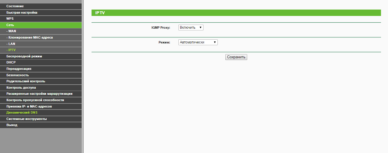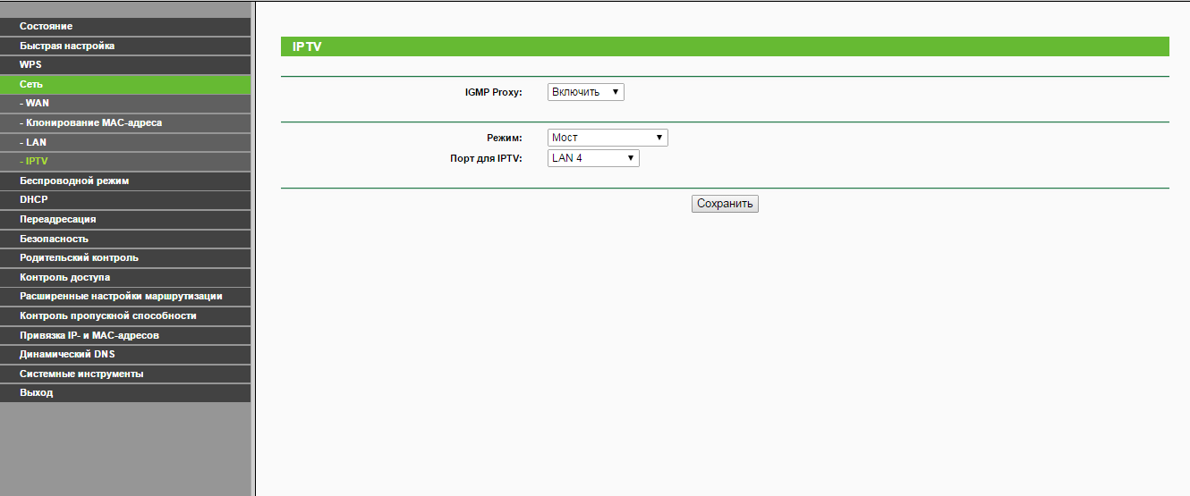 Конфигурация берёт своё начало с выбора режима под названием «Мост» в меню «настроек» маршрутизатора. В случае, если такой режим не предусмотрен отдельными видами роутеров TP-Link, следует выбрать строку «Порт IPTV STB», находящееся в разделе «Сеть». На данном этапе появится выбор необходимого количества портов для реализации подключения к телевидению. Выбираем подходящий вариант и нажимаем на «Сохранить».