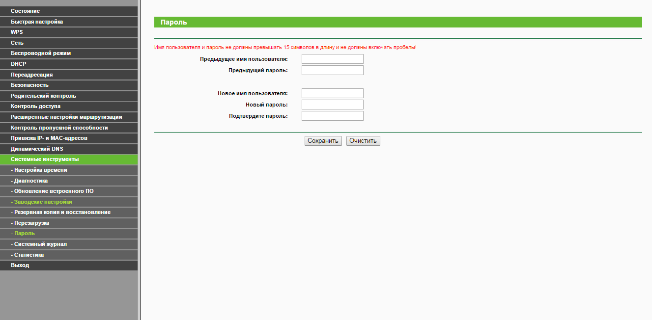Заходим “Системные инструменты – Пароль”, вводим предыдущее имя пользователя и пароль (admin/admin), вводим новое имя пользователя и пароль. Сохраняем. Теперь доступ к настройкам будет возможен с новыми данными.