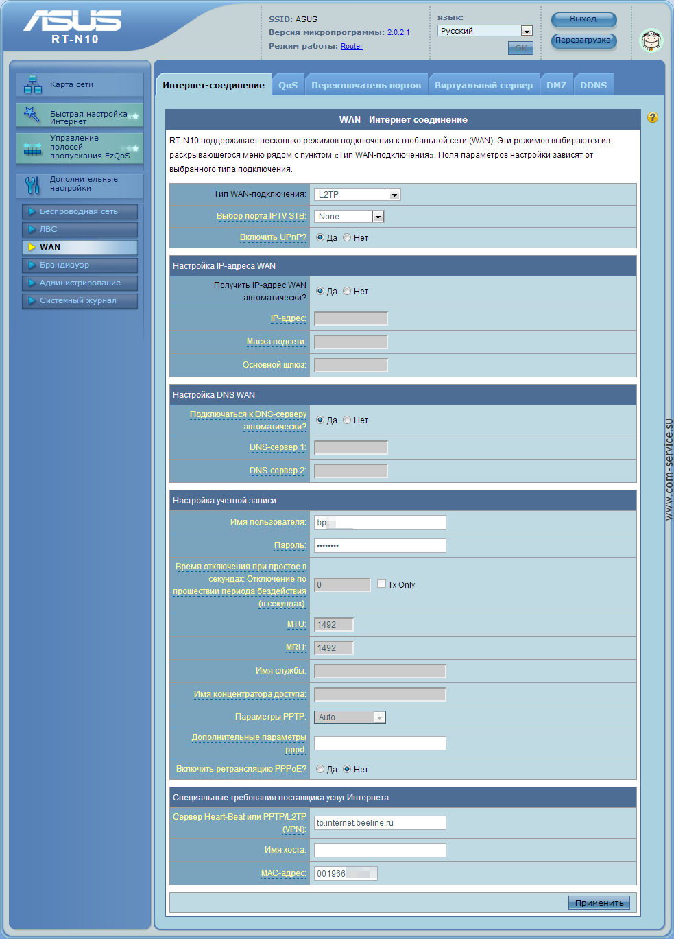 Настройка подключения L2TP Билайн на Wi-Fi роутере Asus RT-N10